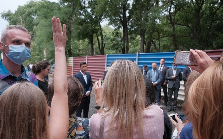 Першим об’єктом для хизування перед Зеленським був відреконструйований міський ЦНАП «Прозорий офіс». Про візит сюди офіційно не говорили, але всім було відомо. З самого обіду люди вишикувались на вулиці Двірцевій біля ЦНАПУ. На момент прибуття гаранта там вже було людно, і практично неможливо пройти. Людей навіть не зупиняли річки води, які текли поруч із закладом, через те, що відбувся прорив каналізації, ні палюче сонце, ні десятки президентських охоронців.