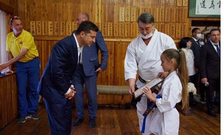 У школі гарант подивився, як тренують дітей у секції карате. Після завершення занять вихованці школи подарували йому диплом почесного першого ступеня майстра, іменний пояс.